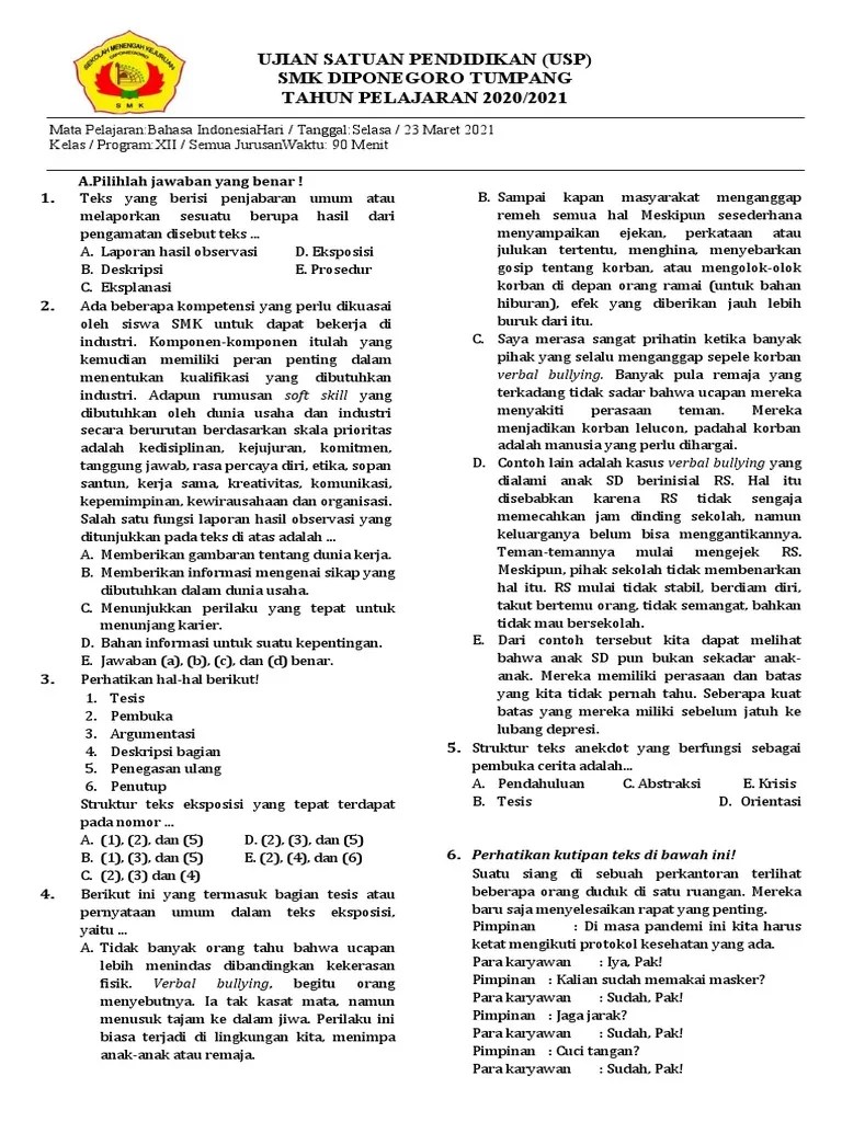 Soal Usp Bahasa Indonesia Smk 2020 : Latihan Soal Usp Unbk Bahasa Indonesia Sma Smk 2021 Sainsologi / Prediksi soal unbk smk bahasa indonesia.